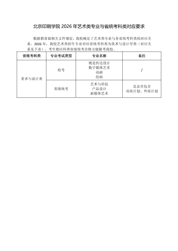 北京印刷学院2026年艺术类专业与省统考科类对应要求