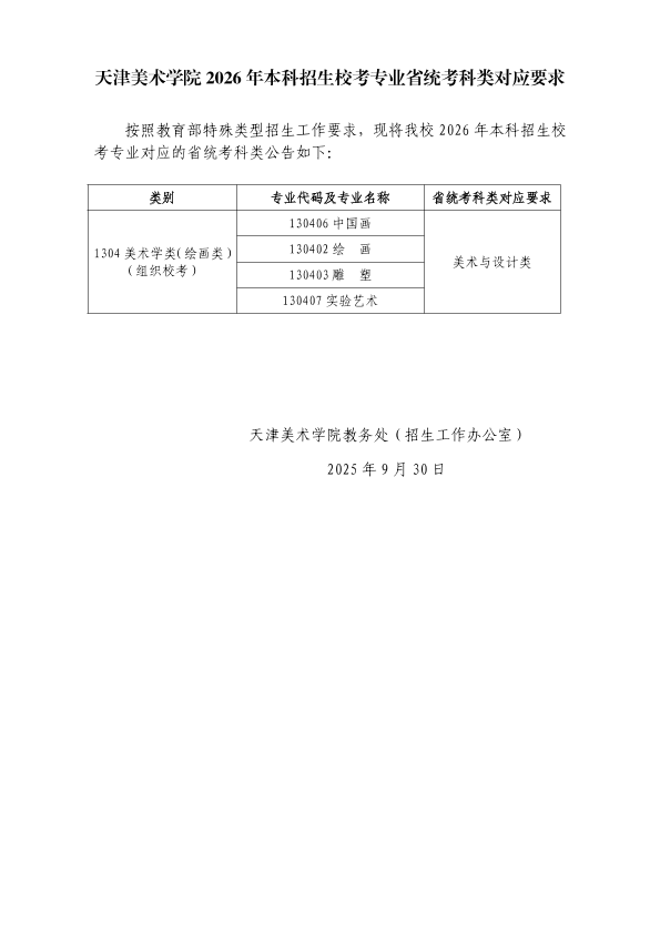 天津美术学院2026年本科招生校考专业省统考科类对应要求