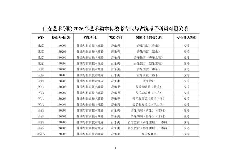 根据教育部相关文件规定,现将各省审核通过的我校2026年艺术类本科校考专业与省级统考子科类对照关系公布如下。请有意报考我校的考生,务必仔细阅读对照表中招生专业在生源所在省(区、市)对应的省统考子科类。