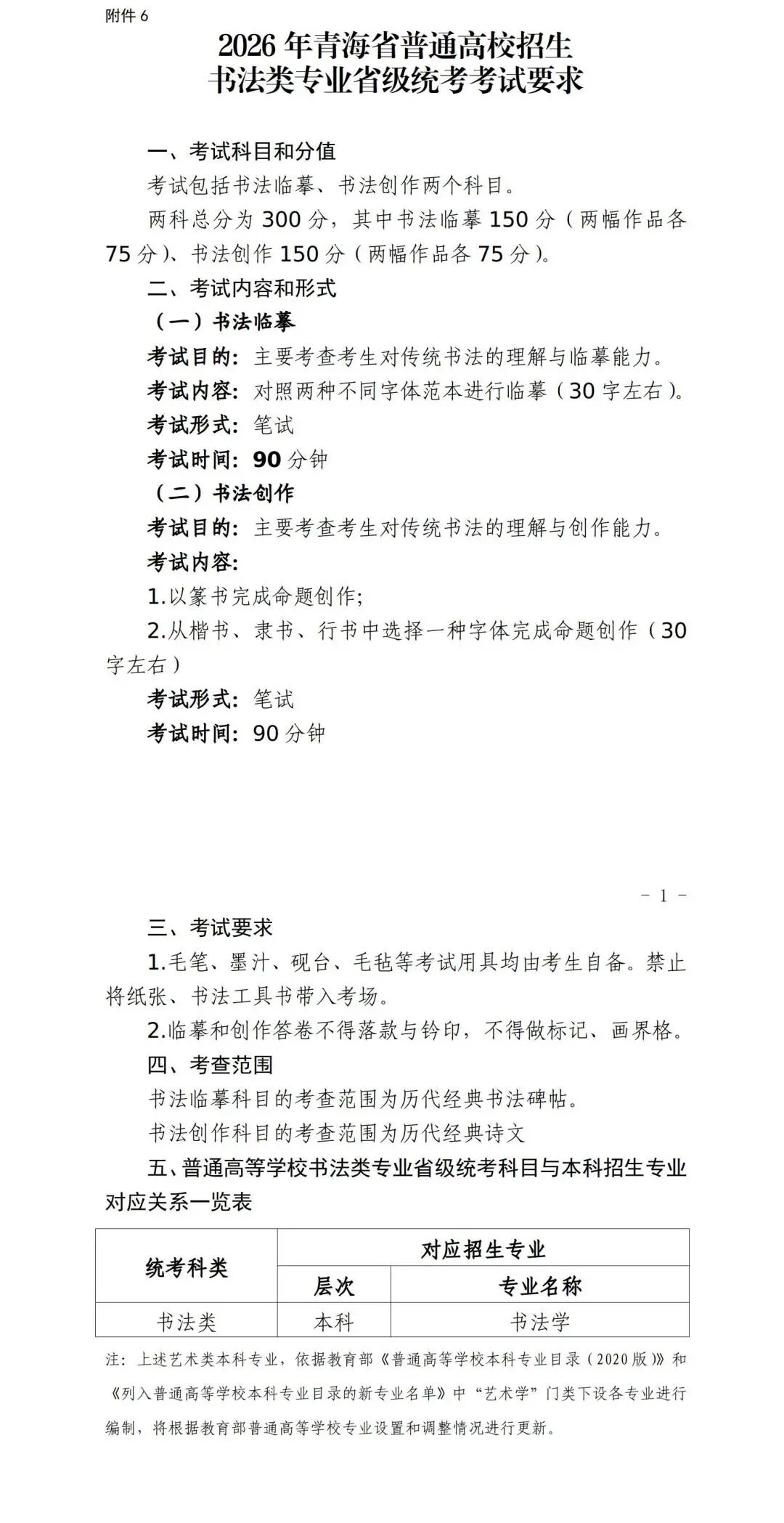 6.2026年青海省普通高校招生书法类专业省级统考考试要求