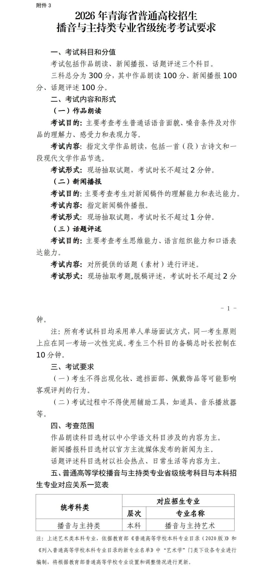 3.2026年青海省普通高校招生播音与主持类专业省级统考考试要求