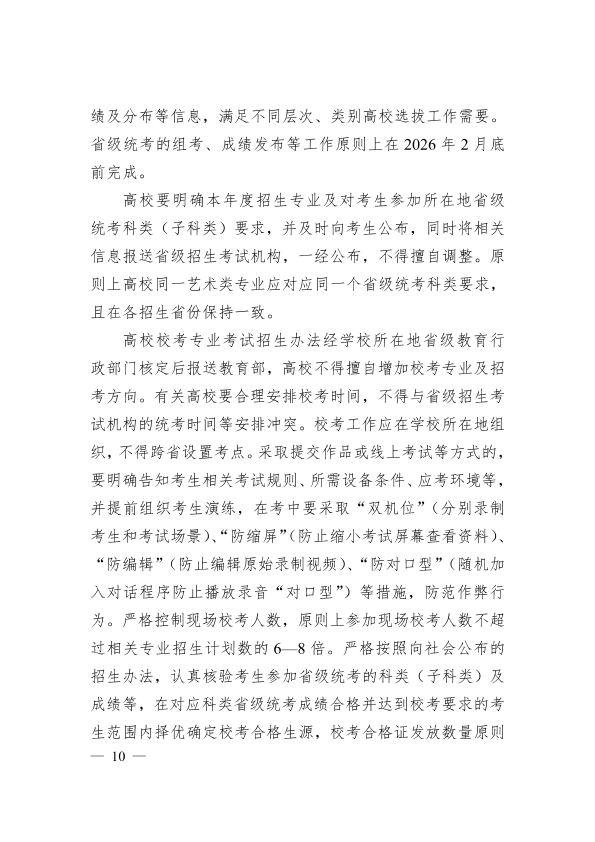 (五)科学确定考核方式和内容。各地和有关高校要紧紧围绕人才培养定位,根据学科专业特点,持续优化考核方式和内容,构建引导学生德智体美劳全面发展的考核内容体系。要强化人文素养和专业能力考查,突出创新思维和非智力因素考查,不断完善多维度的考核评价标准,提高选拔质效。要避免影响中学教育教学秩序,有关高校组织校考时间不得早于2026年1月1日。