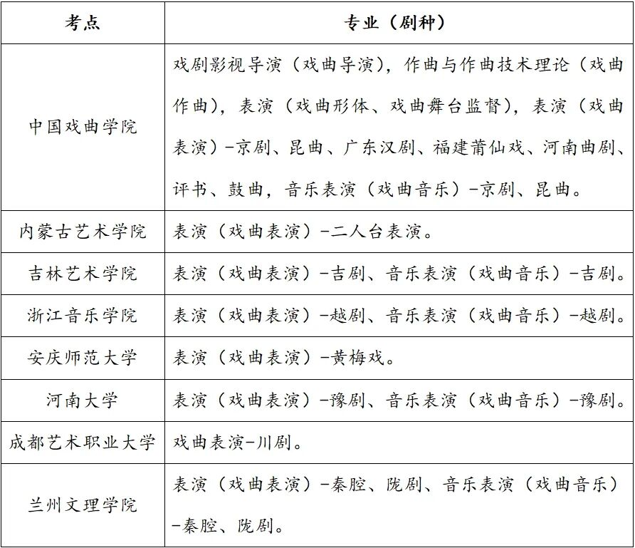 根据戏曲类专业招生院校招收剧种情况,相关专业(剧种)考试考点如下: