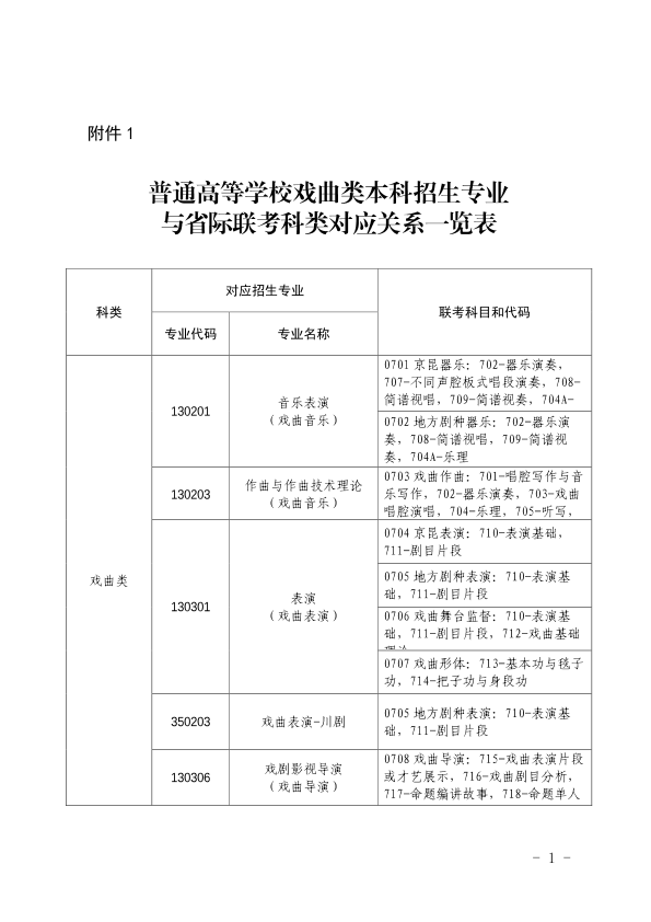 1.普通高等学校戏曲类本科招生专业与省际联考科类对应关系一览表