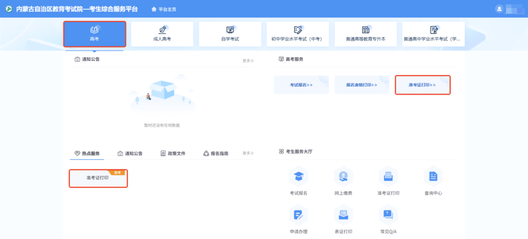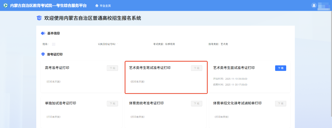 2026年普通高校招生艺术类专业统考笔试《艺术类专业统考准考证》(以下简称准考证)今日开始打印。考生登录内蒙古自治区教育考试院考生综合服务平台(https://www4.nm.zsks.cn/BaseStudent/),点击“高考”栏目,进入“准考证打印”模块,选择“艺术类考生笔试准考证打印”。具体步骤见下图。