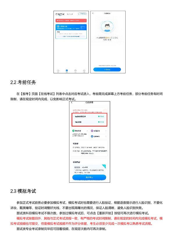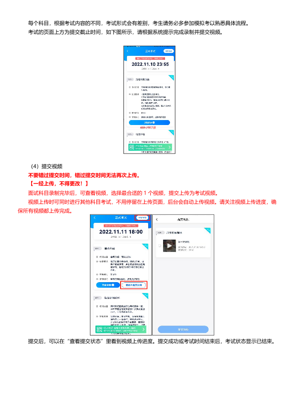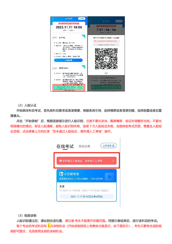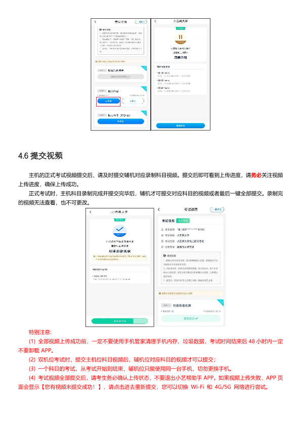 (11)考试视频全部提交后,请考生务必确认上传状态,不要退出小艺帮 APP。如果视频上传失败,APP页面会显示【重新上传】,请留意视频上传页或【报考】列表页底部,点击【重新上传】即可。可以切换Wi-Fi和4G/5G网络进行尝试。