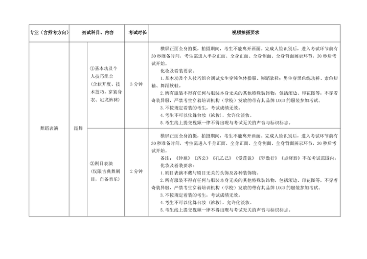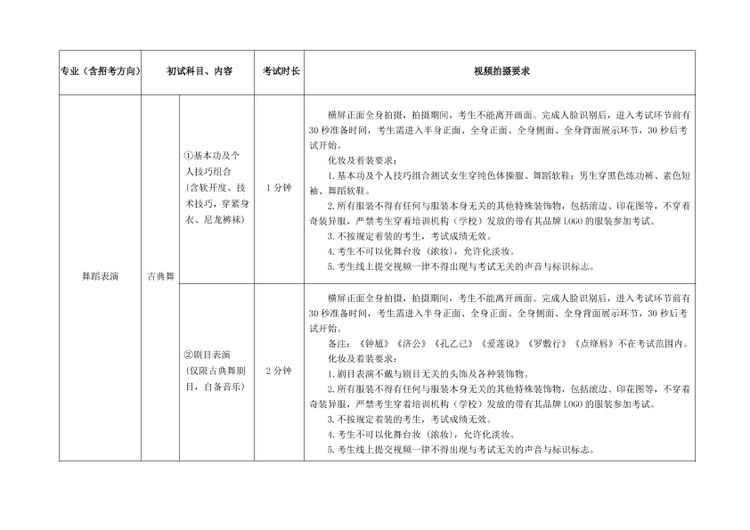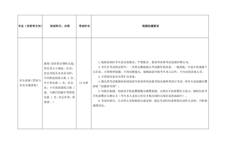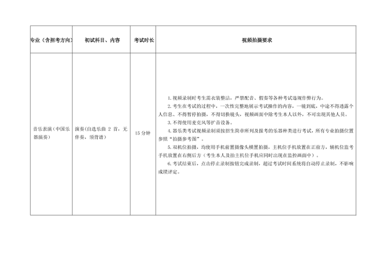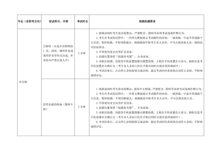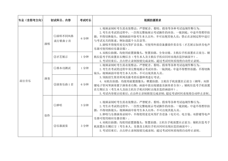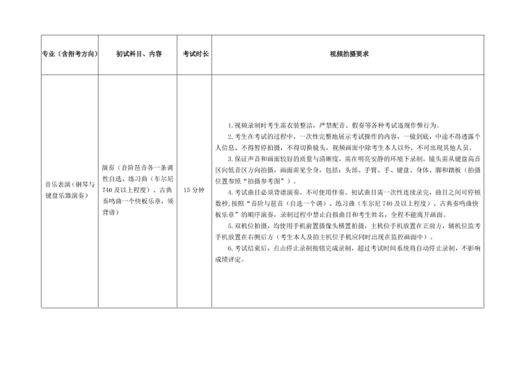 (1)严格按照考试科目的考试内容、拍摄要求等拍摄视频。提交视频考试曲目须与报名时填报的考试曲目一致,如未按规定要求考试的,一经发现按照考试违规处理,影响考生考试成绩。