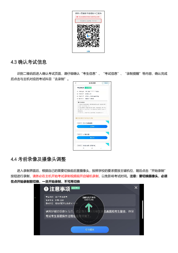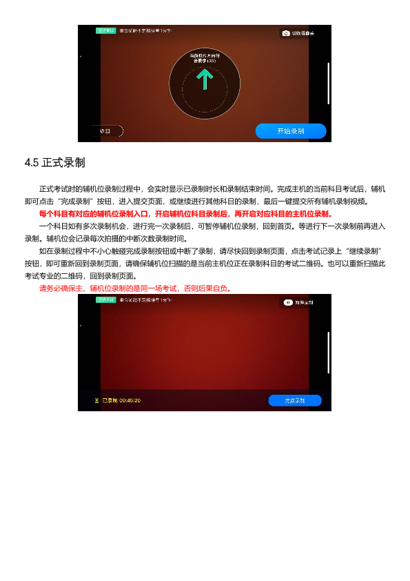(8)正式考试时,考生点击【正式考试】,务必仔细阅读“考试内容”“拍摄要求”“拍摄时间”“注意事项”等内容。进入正式考试后,辅机先扫描主机位二维码,开启辅机位录制。考生须在规定时间内完成初试考试科目的视频录制并上传,考试时间截止时还未提交考试视频则视为自动放弃考试资格。每个面试科目有3次录制机会,录制按钮上会显示录制次数。每个科目只能提交1个视频,无须使用全部的录制机会。科目录制完毕后,可查看视频,并选择最合适的1个视频在考试时间截止前提交上传,作为考试视频。