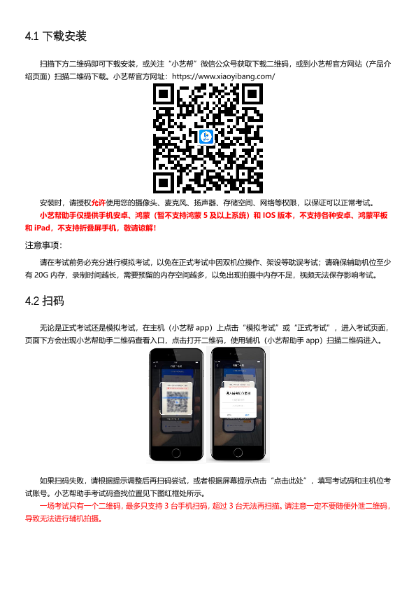(2)安装小艺帮APP的手机为主机,安装小艺帮助手APP的手机为辅机,两个软件不能同时安装在同一台手机上,考试前请确保小艺帮APP及小艺帮助手APP为最新版本。