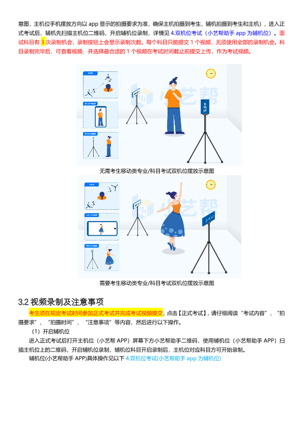 (7)正式考试前考生必须至少完成1次完整的线上模拟考试,熟悉小艺帮APP、小艺帮助手APP的操作流程和考试流程,以免影响正式考试。模拟考试时,按照机位摆放图例要求,多次测试正式考试时双机位摆设位置,确定最佳拍摄点及拍摄角度,高效利用考试时间。(因模拟考试数据占用手机内存空间,注意在正式考试开始之前清理数据,模拟考试提交视频即可删除数据)