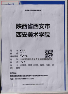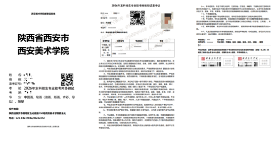考生须于2026年1月12日9:00~2026年1月15日19:00登录西安美术学院本科招生专业校考网上报名系统(https://user.artsstudent.cn/login/10729.htm ),点击“打印中心”→“打印准考证”打印准考证和邮寄信息单(邮寄信息单和准考证图例如下图所示)。