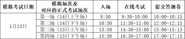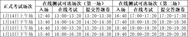 在线测试于2026年1月12日12:30-20:30进行,每位考生须在准考证上规定的两个在线测试场次中,至少选择一场进行测试,熟悉考试流程,在线测试场次及时间安排如下: