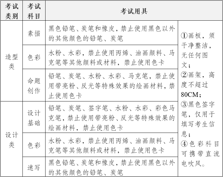 ①铅笔、炭笔、水粉、水彩、马克笔,禁止使用带亮粉、反光等特殊效果的绘画材料,禁止使用色卡;
