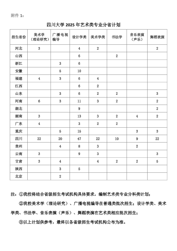 2.四川大学2025年艺术类专业分省计划见附件1。