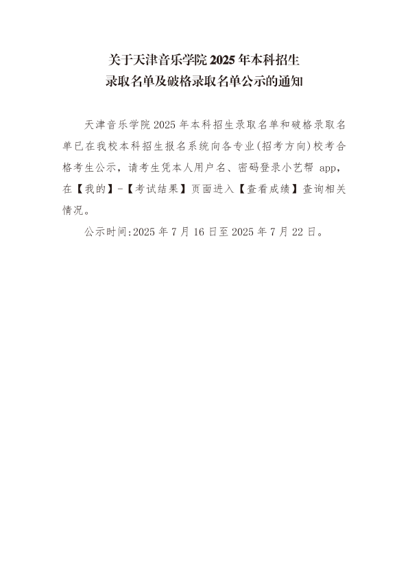 关于天津音乐学院2025年本科招生录取名单及破格录取名单公示的通知