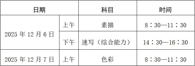 高考美术与设计类专业省统考包括素描、速写(综合能力)、色彩三个科目。各科目考试时间如下: