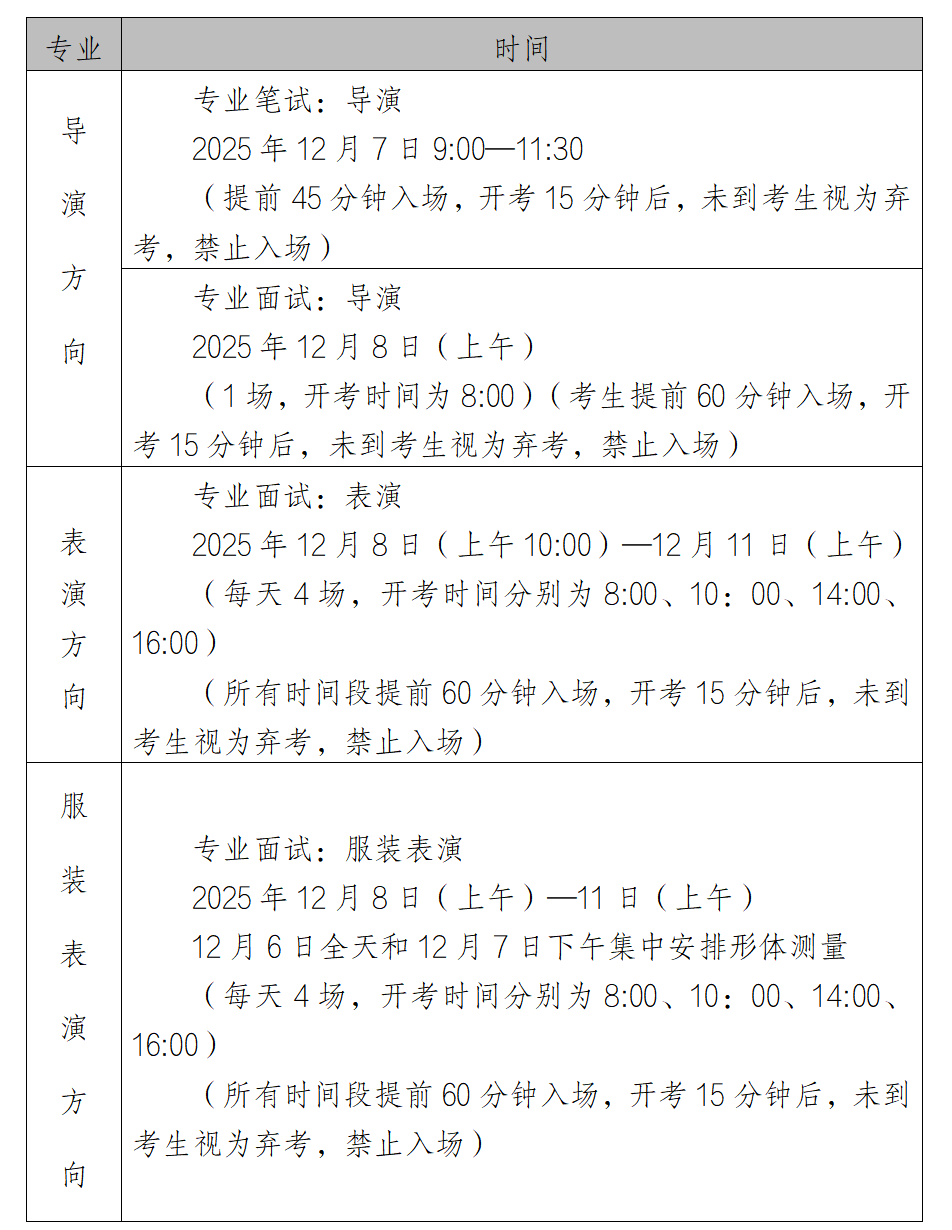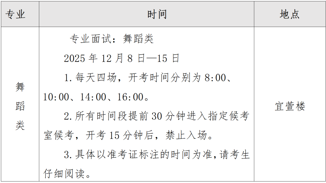 专业面试:开考前60分钟开始进场,考生应于开考前30分钟进入指定的候考室候考,开考15分钟后考生不准进入指定候考室、不得参加当次科目考试。