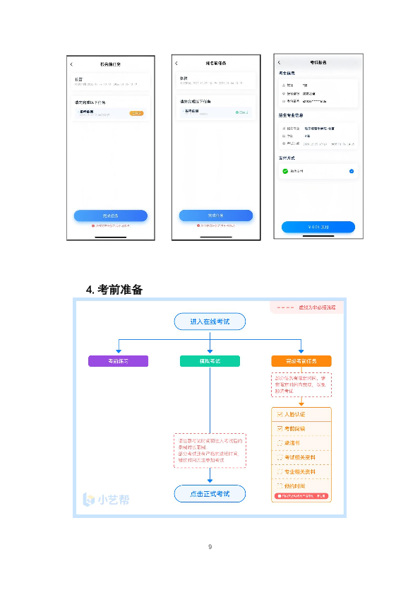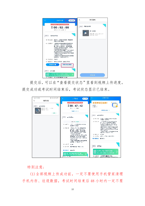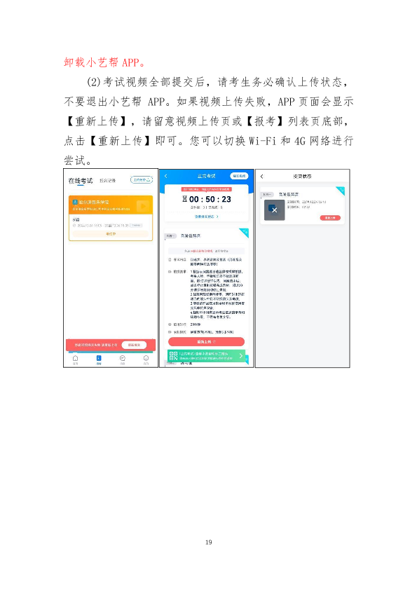 9.考生开始正式考试时,即在小艺帮APP点击了【正式考试】按钮,必须在2小时内完成该招考方向所规定考试内容视频录制并成功提交考试视频。否则将导致考试失败,考生责任自负。考生提交视频后请关注视频上传进度,确保所有视频都上传完成。