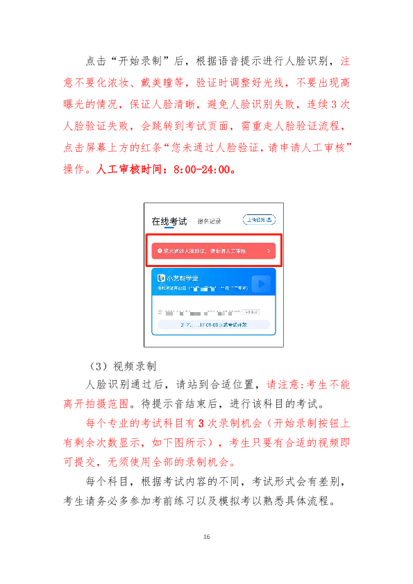 11.考试过程中正在录制视频,如果被中断则本次录制失败,录制机会减少一次(共3次录制机会),本次录制没有视频存在,无视频可提交也会导致考试失败。