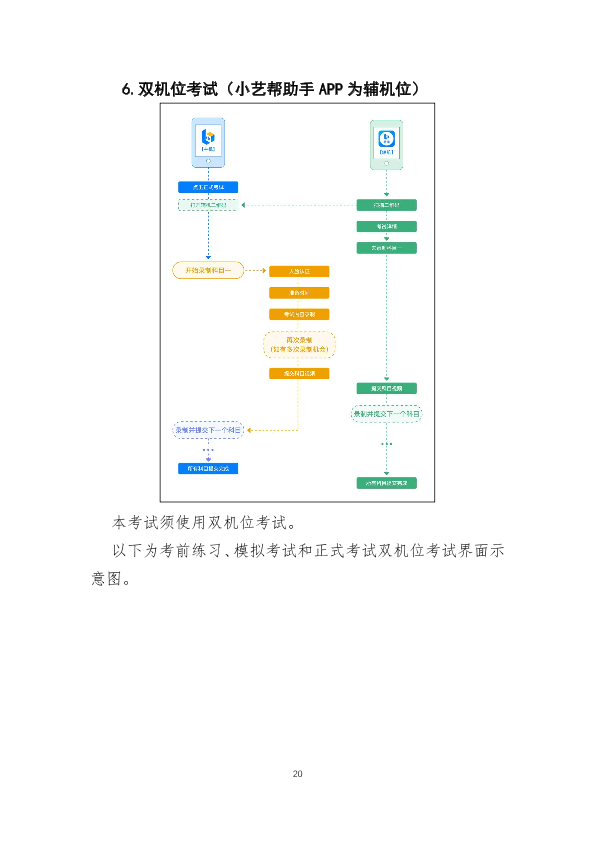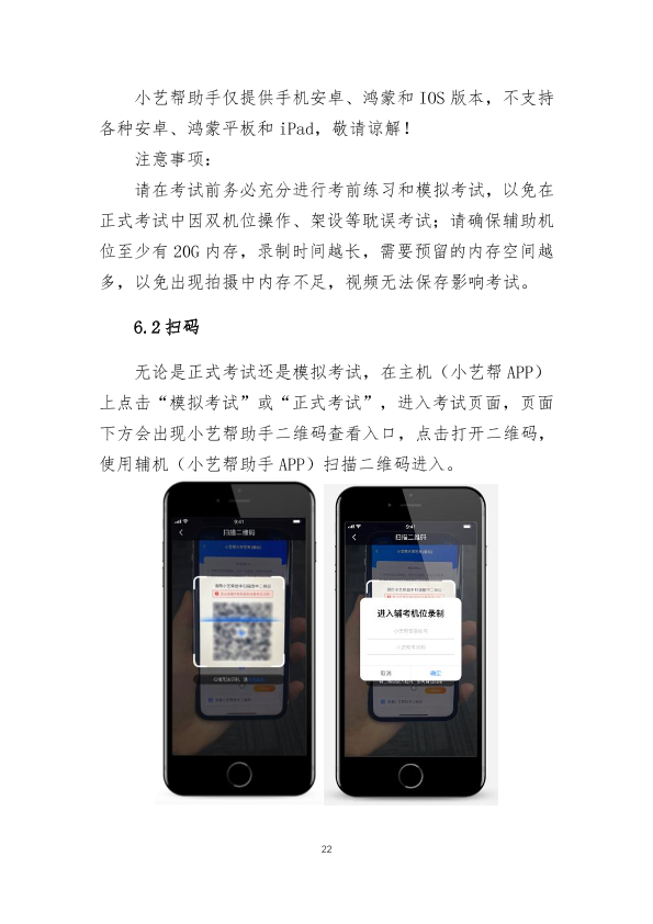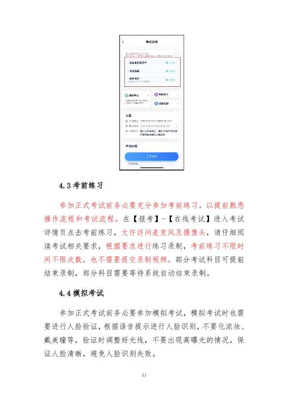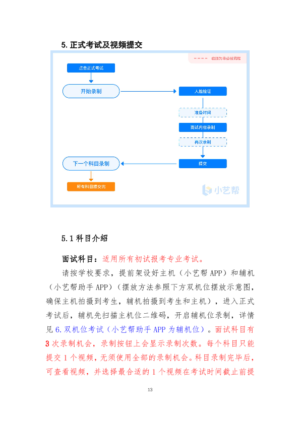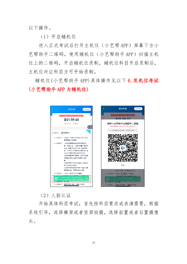 12.视频录制过程中设置双机位,对考生及考试环境同时进行录制。在“小艺帮”APP上设置“考前练习”“模拟考试”功能,方便考生熟悉考试相关功能、演练并确定正式考试时机位摆放及就座位置。模拟考试与正式考试的考试流程一致,包括身份识别、录制、提交等环节。
