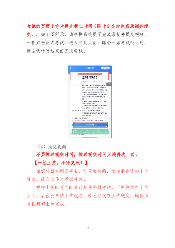 8.正式考试视频录制并提交完成时间为2小时,无论中途是否退出,计时不会停止,页面上将会出现倒计时,倒计时为“0”时还未提交考试视频则视为自动放弃考试资格。