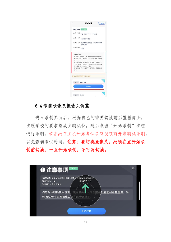 6.录制视频时,考生必须面向摄制镜头(其中钢琴专业考生须调整适当的侧面面向摄制镜头),在一个合适的距离内,确保演唱(演奏)清晰可见。如采用现场钢琴伴奏,须同时出现在适当距离的镜头中且不切换镜头及角度。视频不得有显示考生信息的字幕和场地布景,不得有考生介绍。