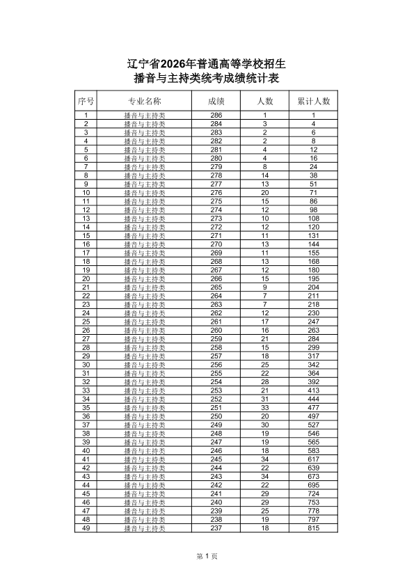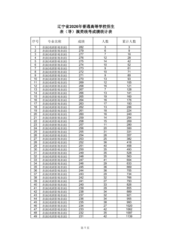 辽宁省2026年普通高等学校招生艺术类省统考成绩统计表[表(导)演类、播音与主持类]