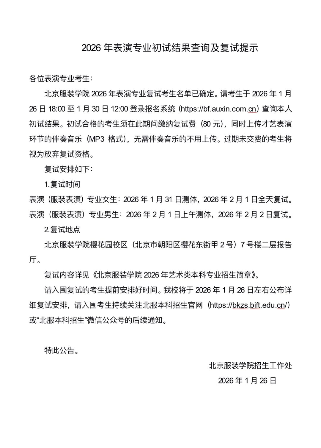 北京服装学院2026年表演专业初试结果查询及复试提示