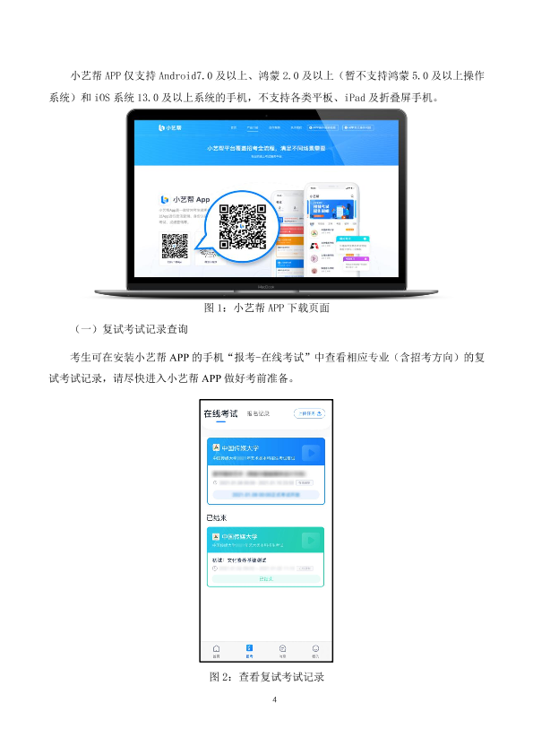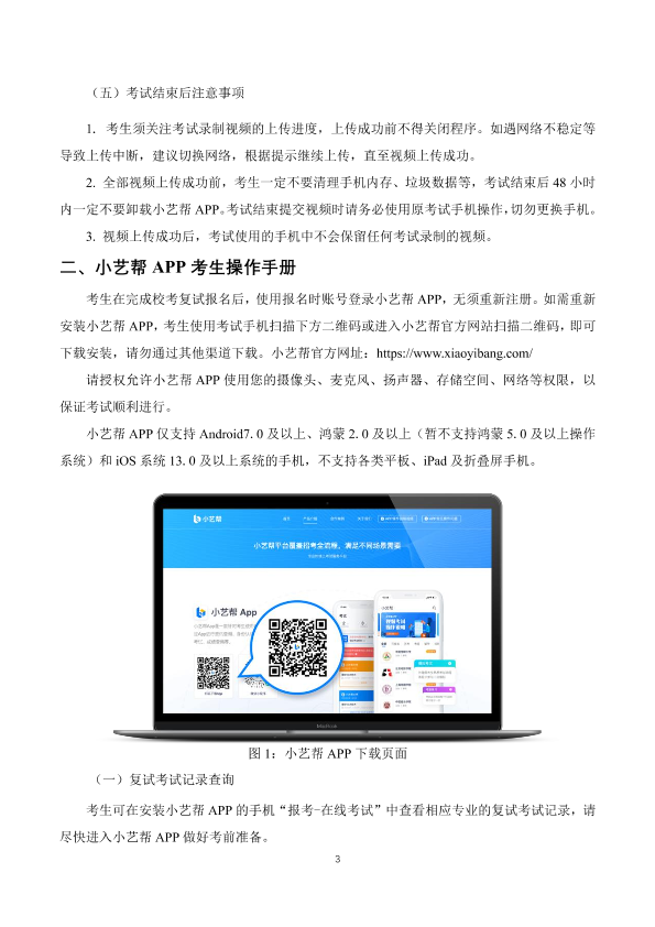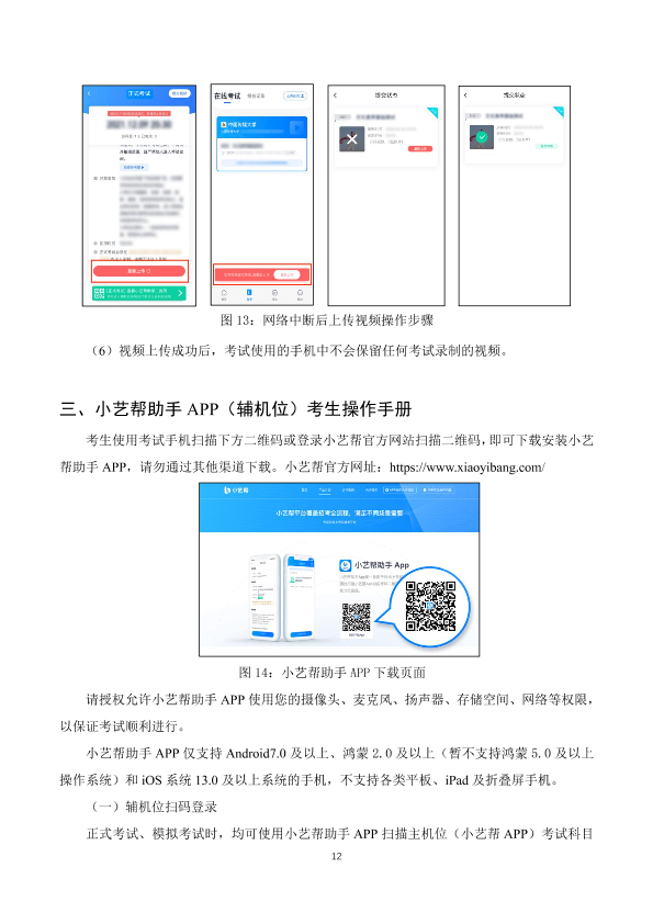 3.考试所用手机的操作系统应为Android7.0及以上、鸿蒙2.0及以上(暂不支持鸿蒙5.0及以上操作系统)或iOS系统13.0及以上的手机。小艺帮APP只支持手机,不支持各类平板、iPad及折叠屏手机。设备具体要求如下: