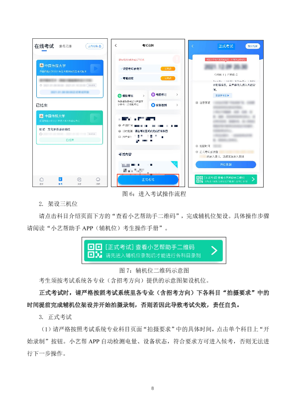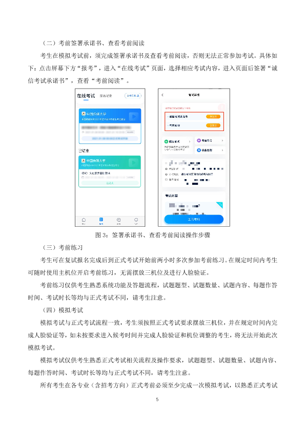 (1)采用三机位考试模式。每专业(含招考方向)有严格的候考时间及作答时间,候考时间结束前考生应完成三机位架设、通过人脸比对。因未按时完成人脸验证,或三机位架设不符合要求,或迟到等原因导致无法参加考试或考试失败的,责任由考生本人承担。