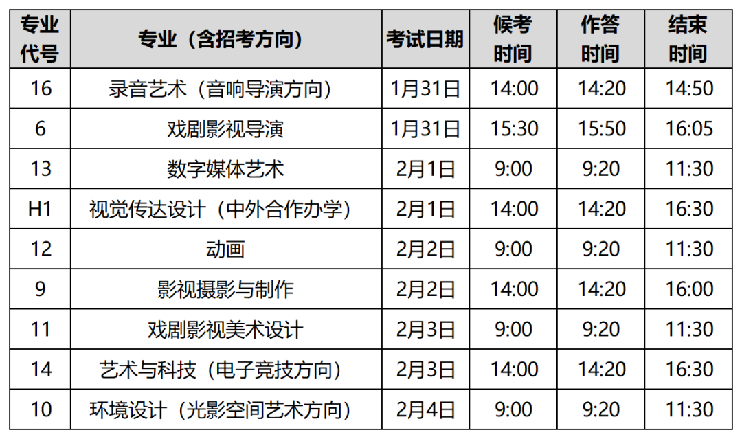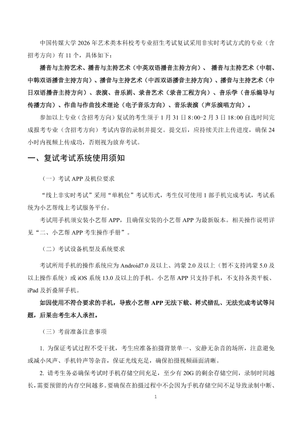 各专业(含招考方向)具体考试内容详见《中国传媒大学2026年艺术类本科校考专业招生简章》附录一。