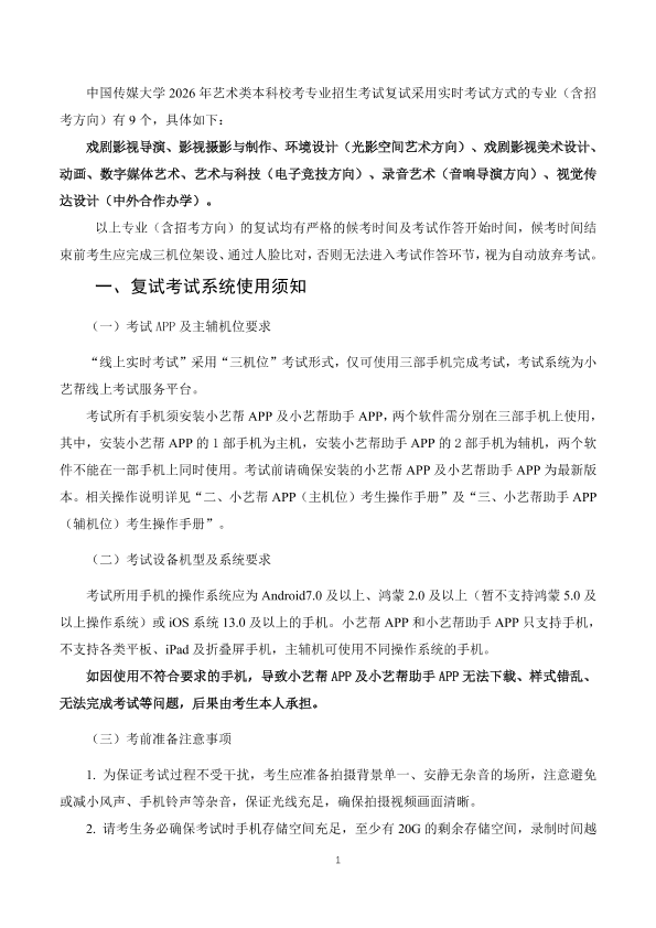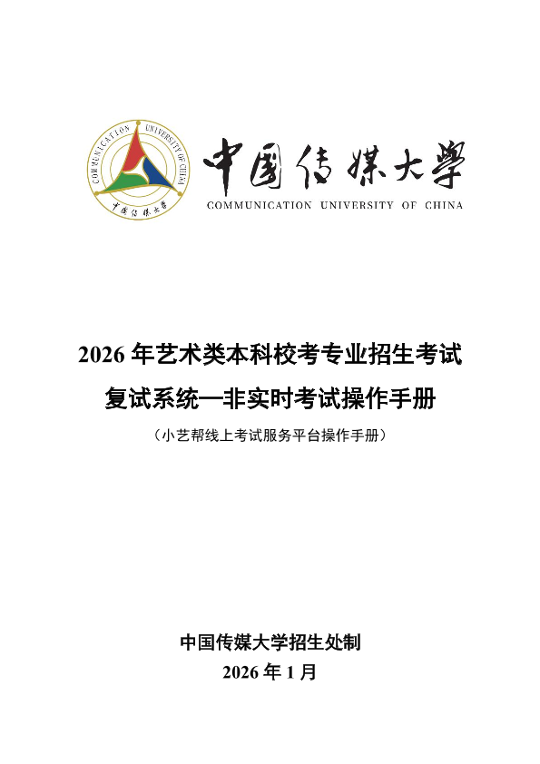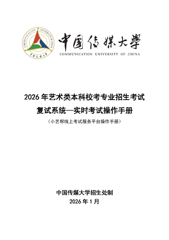 考试系统操作说明详见《中国传媒大学2026年艺术类本科校考专业招生考试复试-实时考试操作手册》。