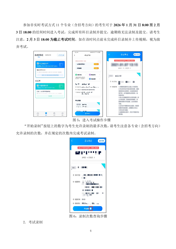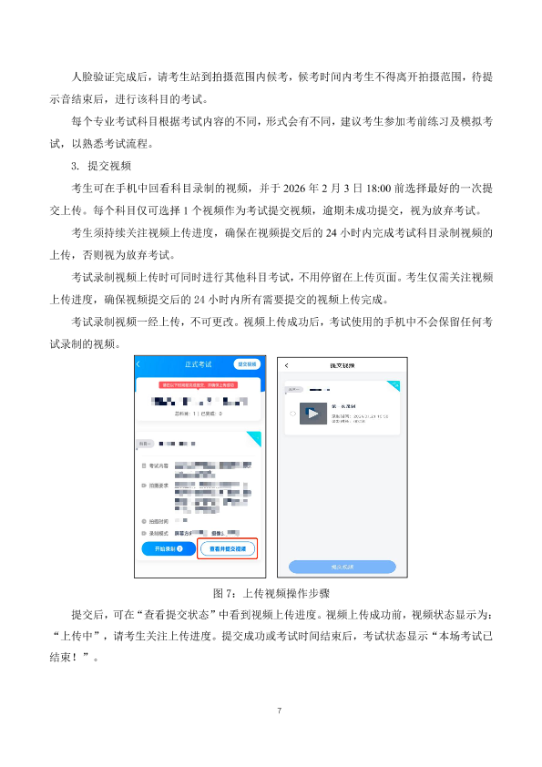 考生须于1月31日8:00-2月3日18:00,通过我校考试系统完成相应报考专业(含招考方向)考试内容的录制并提交。提交后,应持续关注上传进度,确保24小时内考试视频材料上传成功。未完成视频材料上传视为放弃考试。