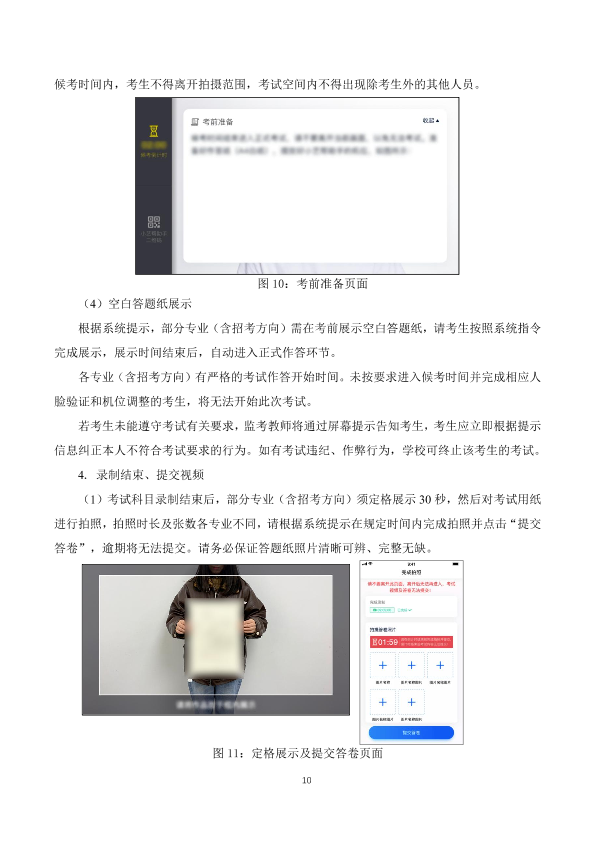 考生须严格按照我校各专业(含招考方向)在考试系统中相应考试科目“拍摄要求”规定的时间完成考前人脸比对,并按时参加正式考试。完成作答后根据系统提示,提交作答内容并确保24小时内考试视频材料上传成功。若因错过考试开始时间或操作不当导致考试失败,责任由考生本人承担。