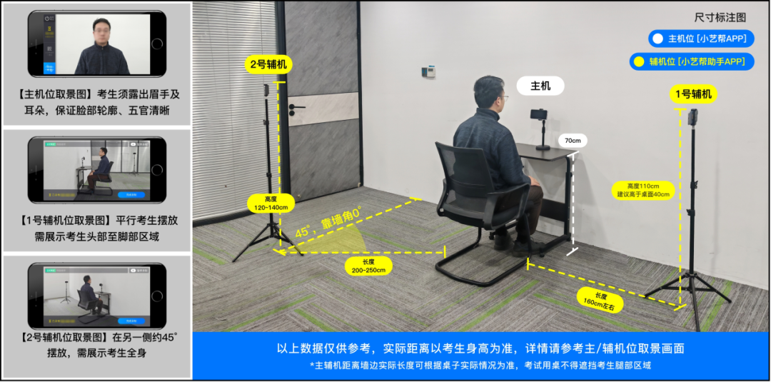 3.实时考试考生须按下图要求位置就座、架设三机位,参加考试。
