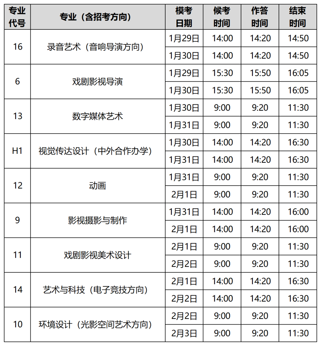 6.采用实时考试方式的专业(含招考方向)模拟考试时间安排见下表: