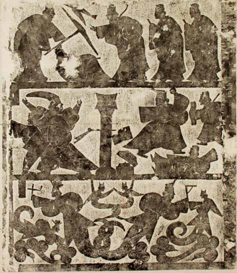 山东省嘉祥县境内的武氏祠画像,从内容到雕刻手法都体现出汉代画像石艺术的成熟水平。其多层构图和饱满的形象组合具有强大的叙事能力,注重轮廓造型和阴刻线造型的风格富于装饰性。
