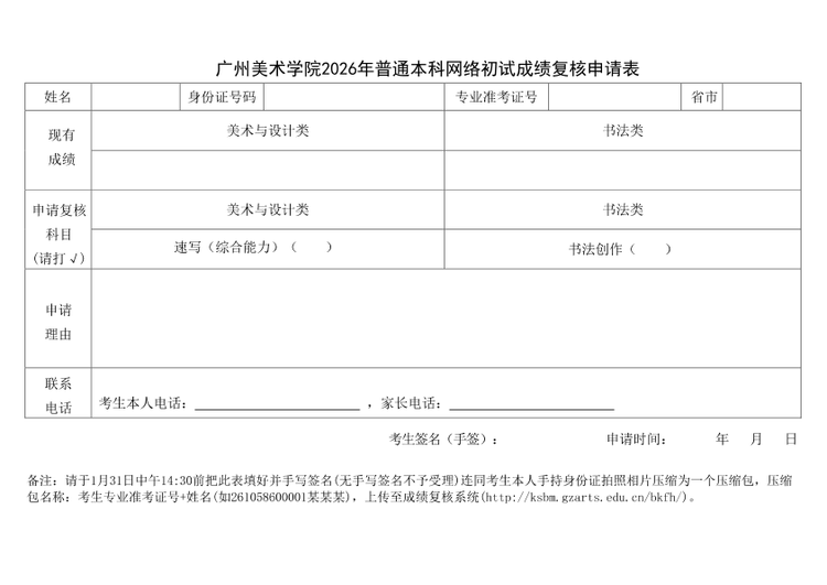 1.《广州美术学院2026年普通本科网络初试成绩复核申请表》(见附件,须考生本人手写签名拍照后上传);