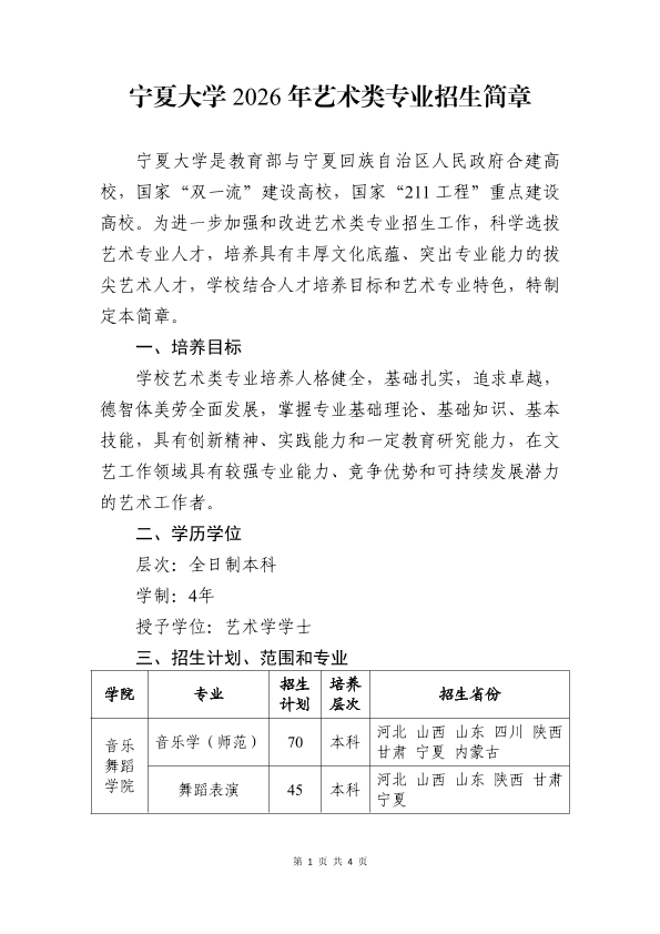 宁夏大学2026年艺术类专业招生简章