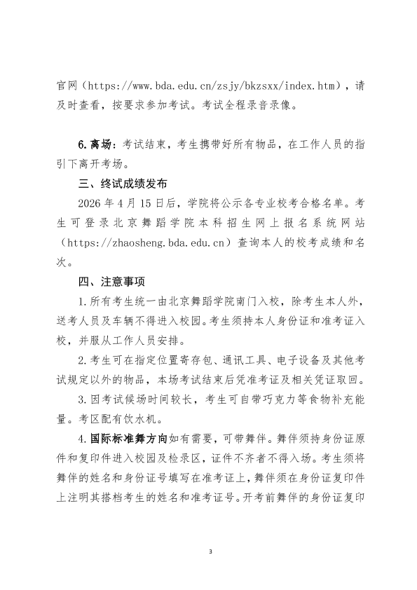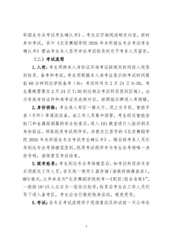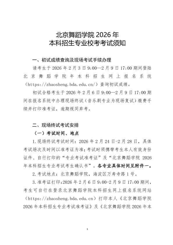 北京舞蹈学院2026年本科招生专业校考考试须知