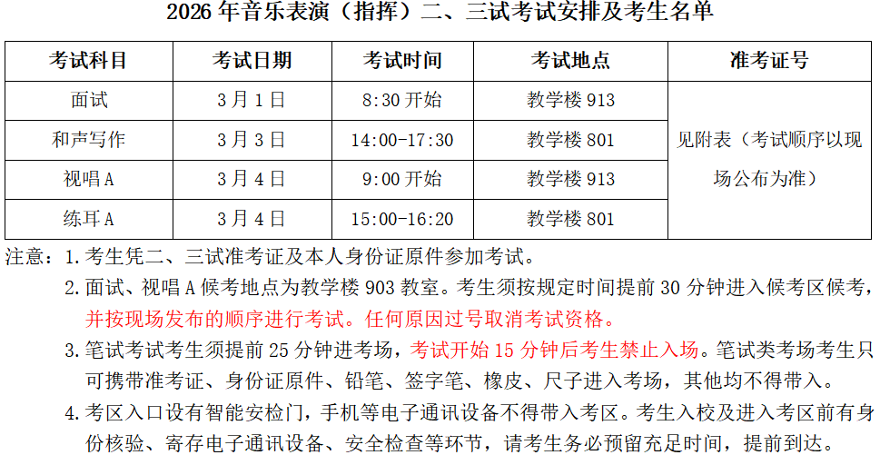 中国音乐学院2026年音乐表演(指挥)二、三试考试安排及考生名单
