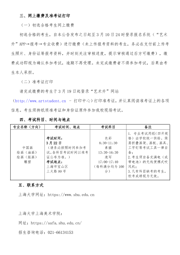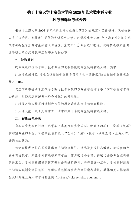 关于上海大学上海美术学院2026年艺术类本科专业校考初选及考试公告