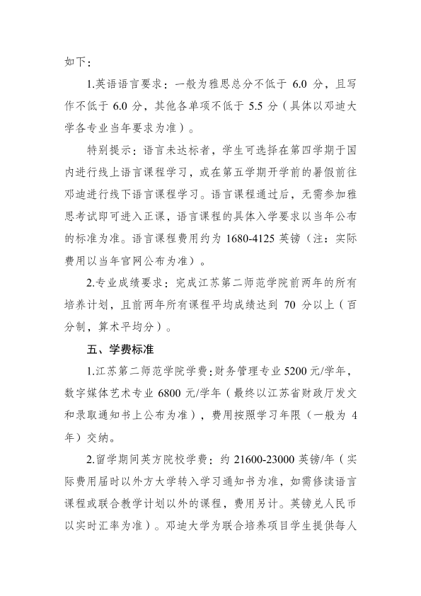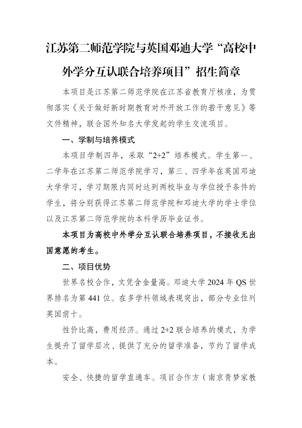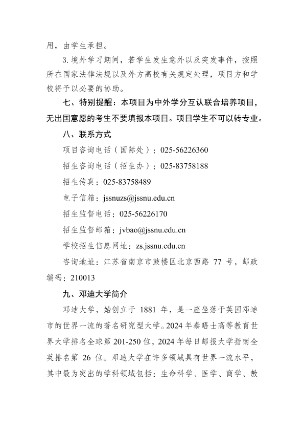 江苏第二师范学院与英国邓迪大学“高校中外学分互认联合培养项目”招生简章