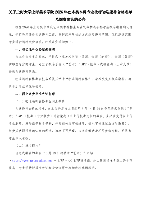关于上海大学上海美术学院2026年艺术类本科专业校考初选递补合格名单及缴费确认的公告