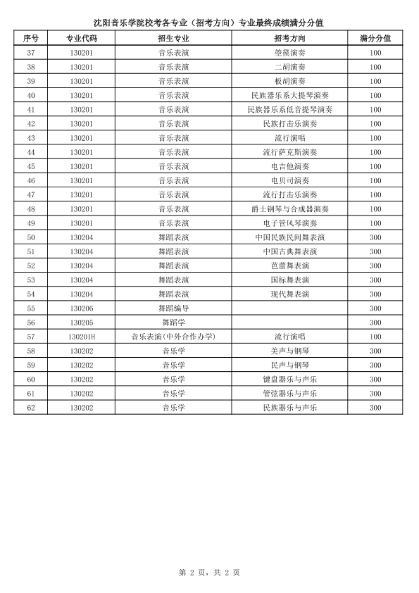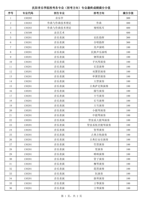 附件1:《沈阳音乐学院校考各专业(招考方向)专业最终成绩满分分值》