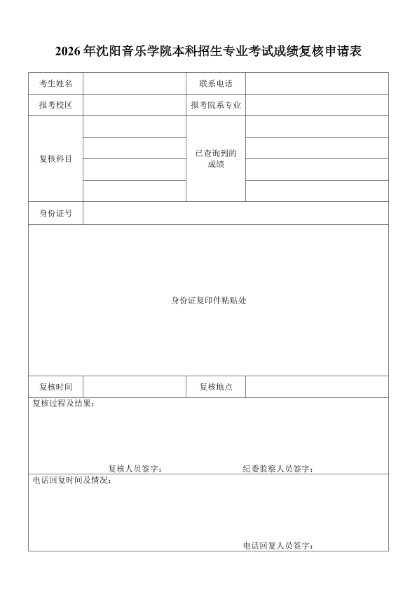 考生如对成绩有异议,可自行下载并按要求填写《2026年沈阳音乐学院本科招生专业考试成绩复核申请表》(可至页面下方下载附件),于2026年4月13日—15日(9:00—11:30,13:30—16:00)传真至024-23894405,逾期不予受理。考生成绩复核工作将在我院纪委的监督下进行。复核结果将电话通知考生,请保持电话畅通。复核范围仅限漏评、登分和统分错误,对于评分标准、评卷宽严异议不予受理。