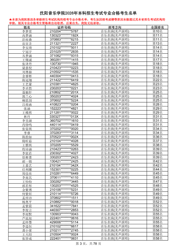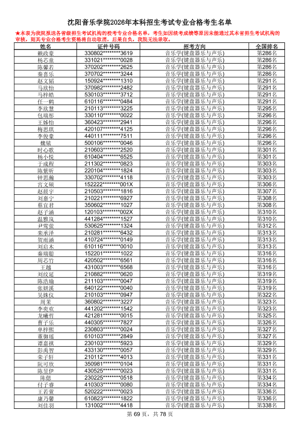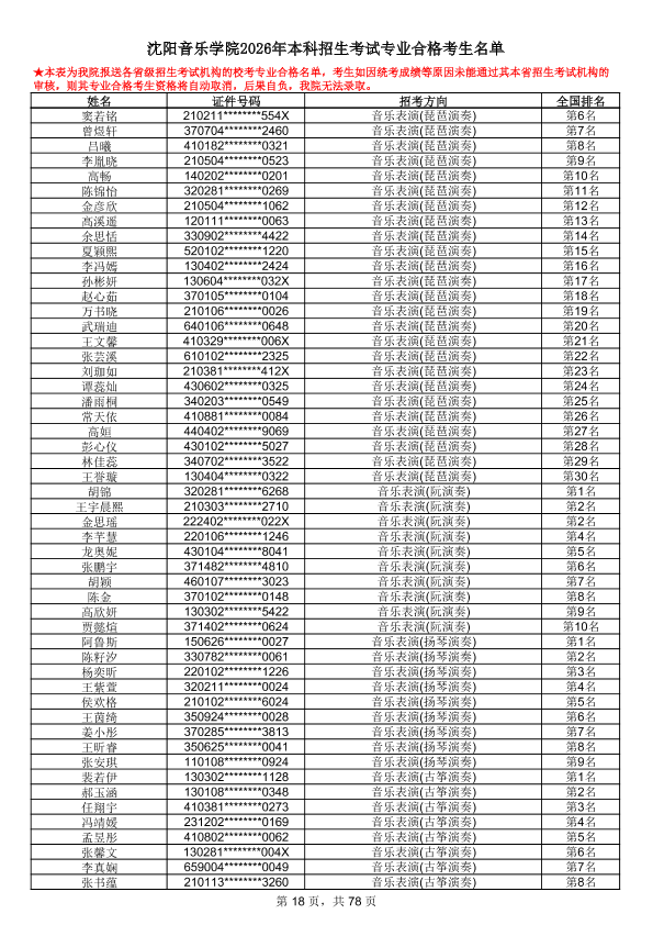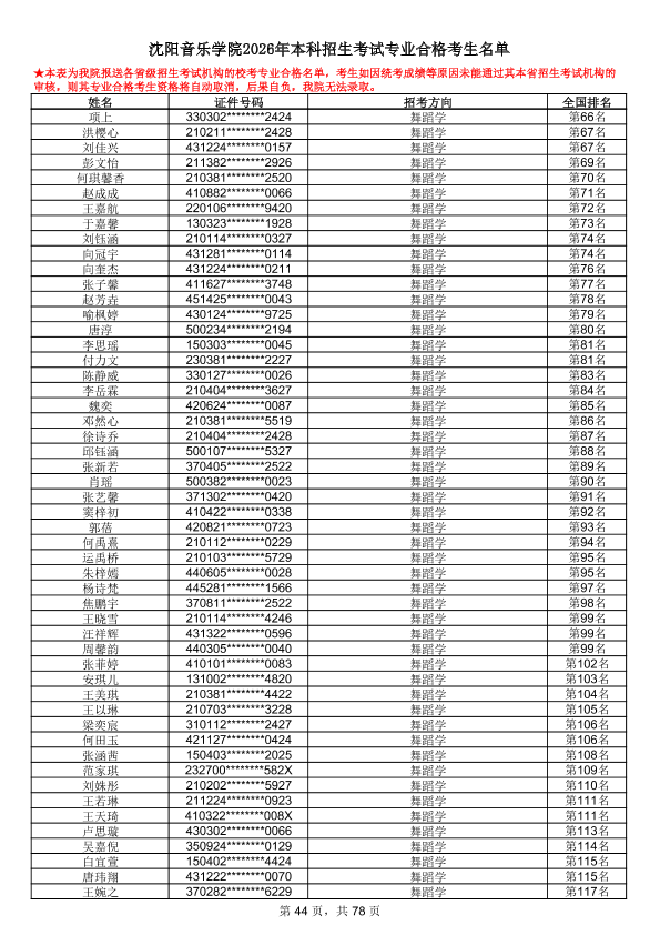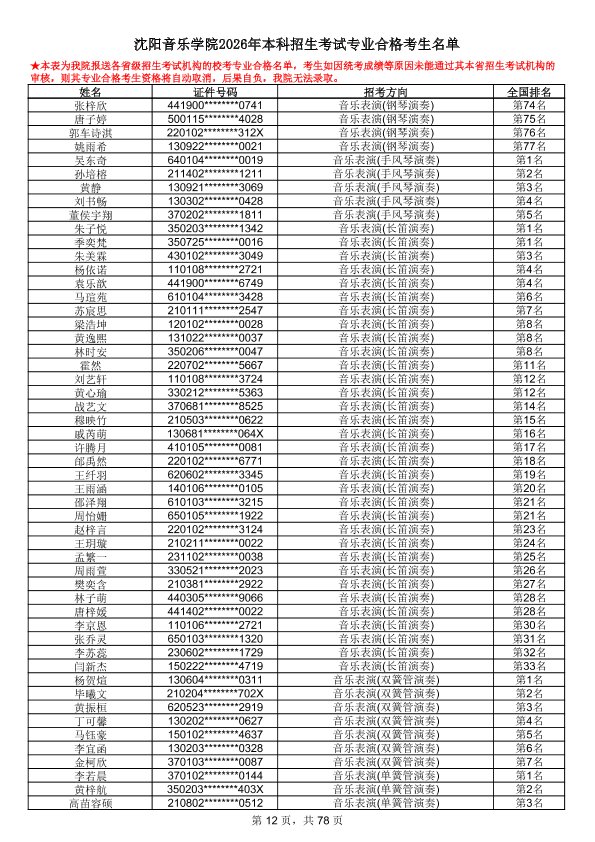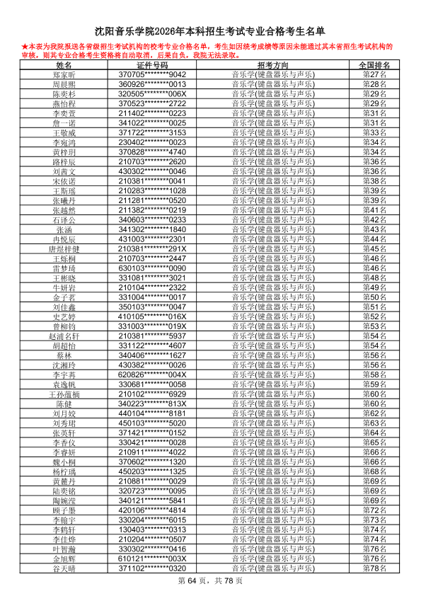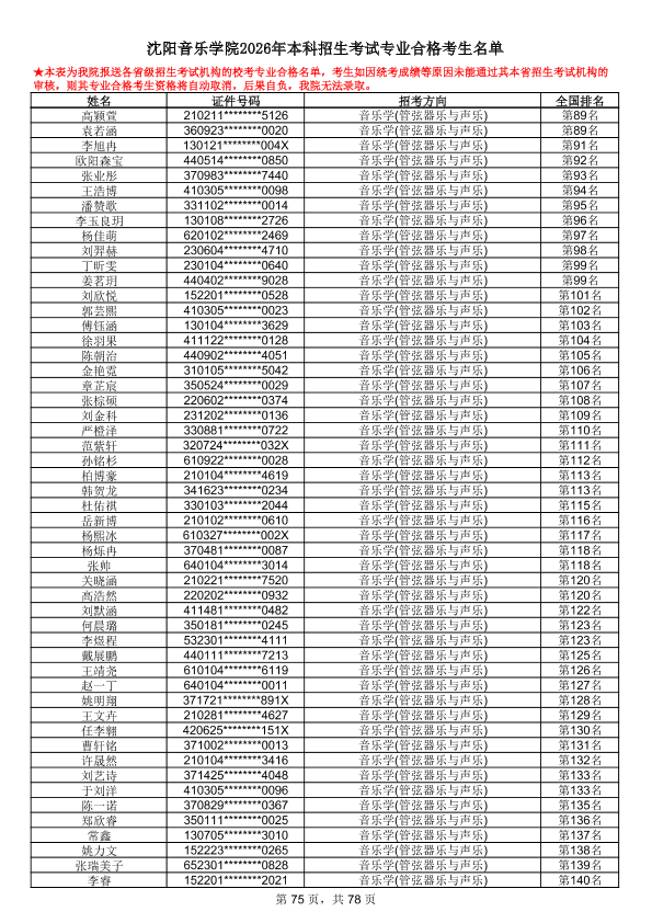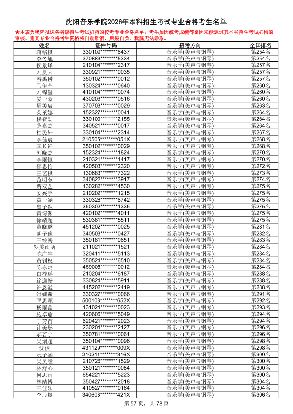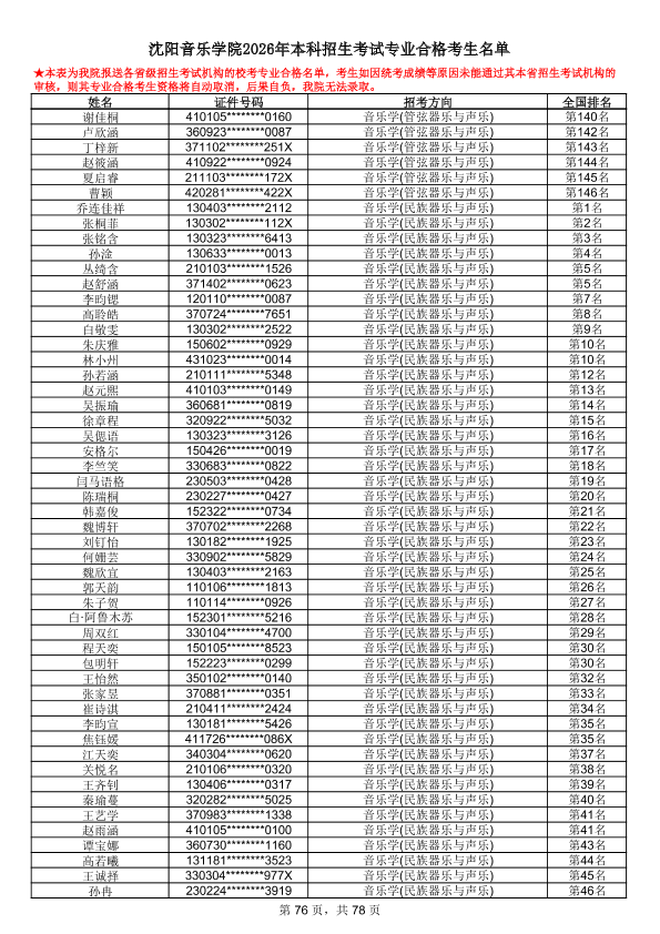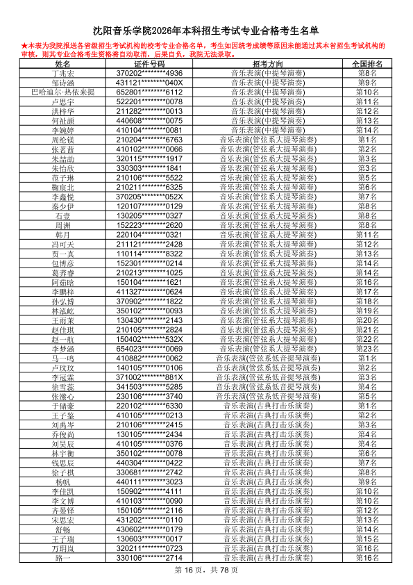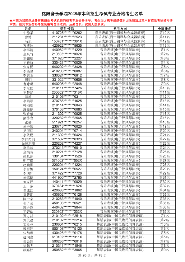 沈阳音乐学院2026年本科招生考试专业合格考生名单