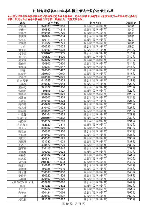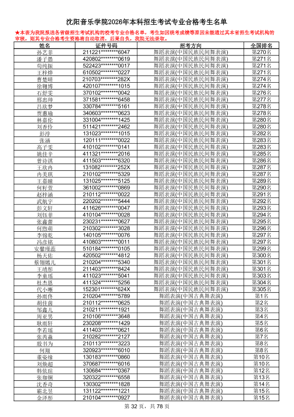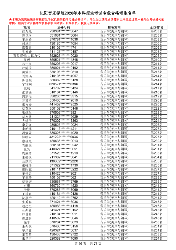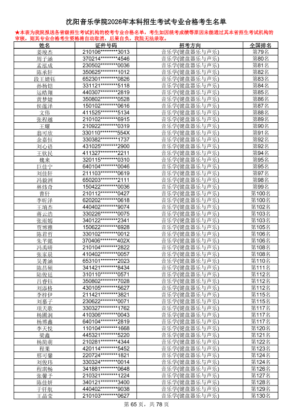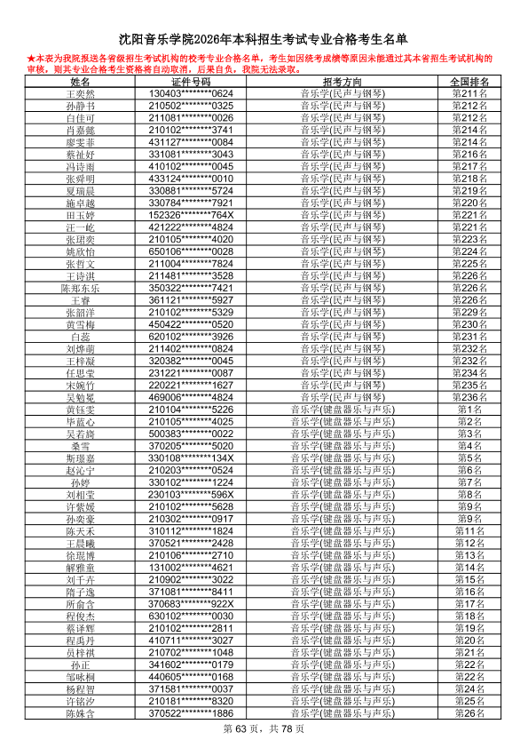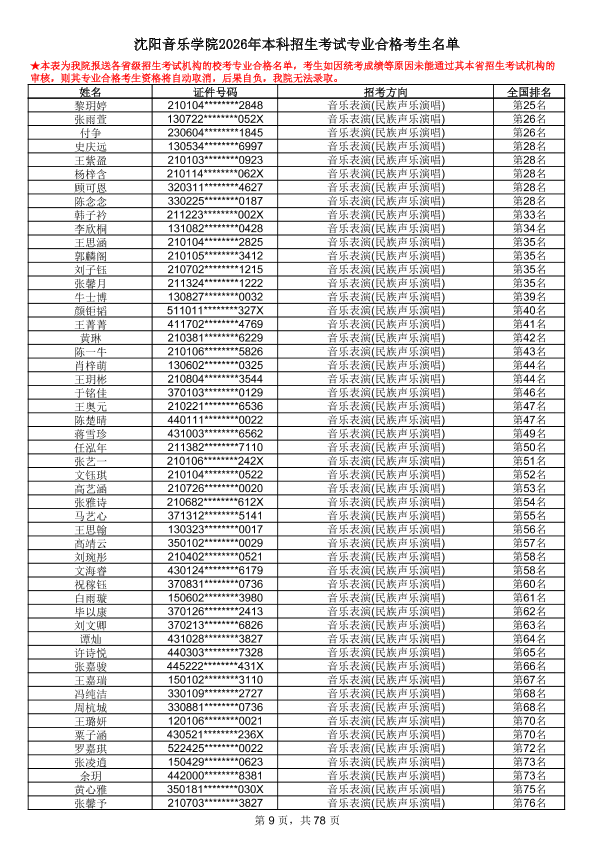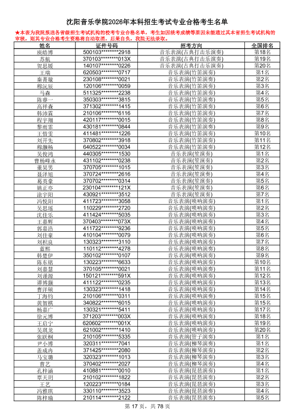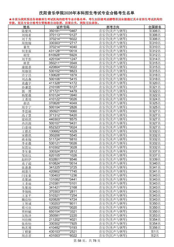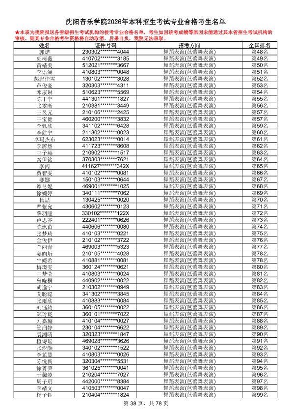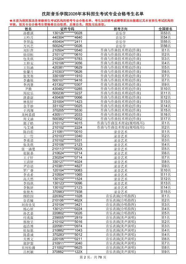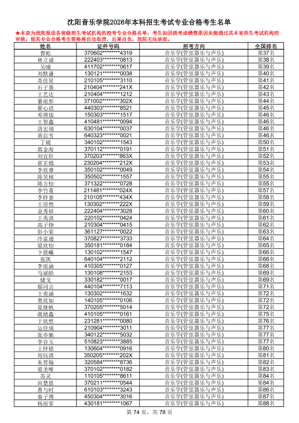 沈阳音乐学院2026年本科招生考试专业合格考生名单