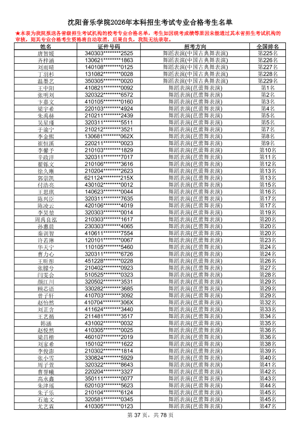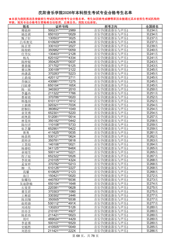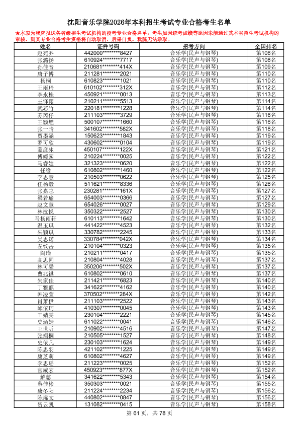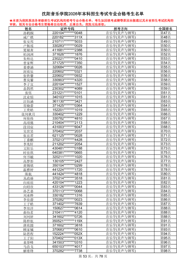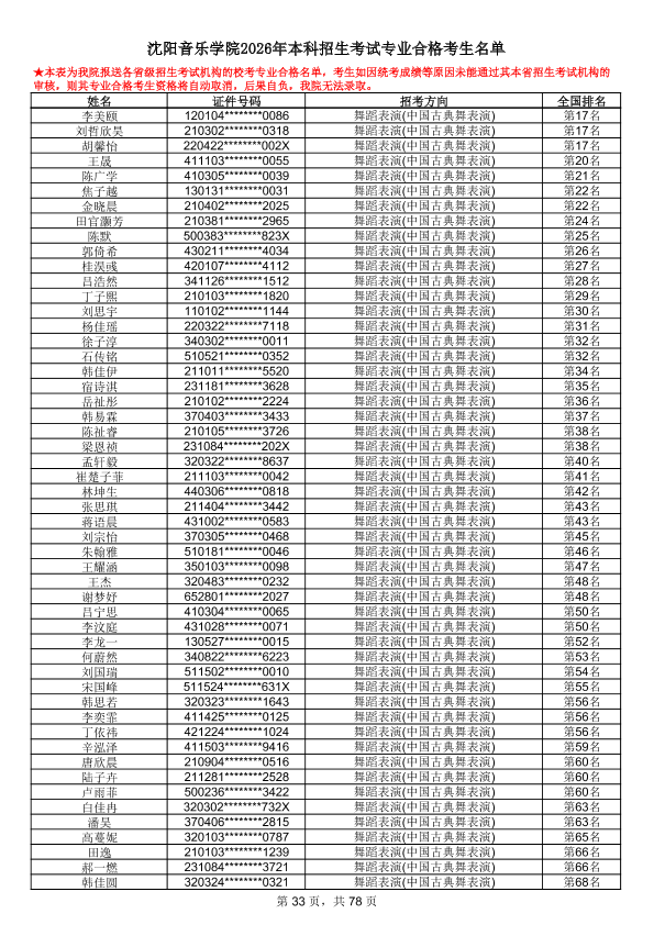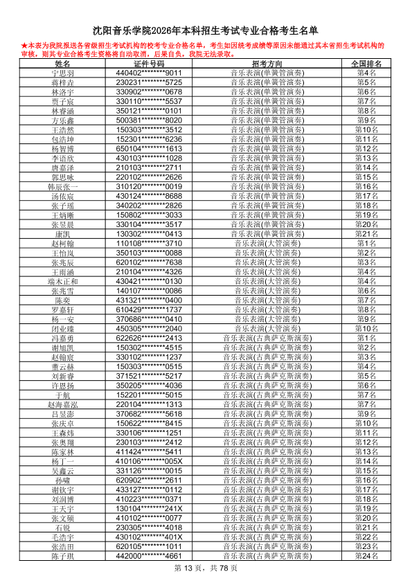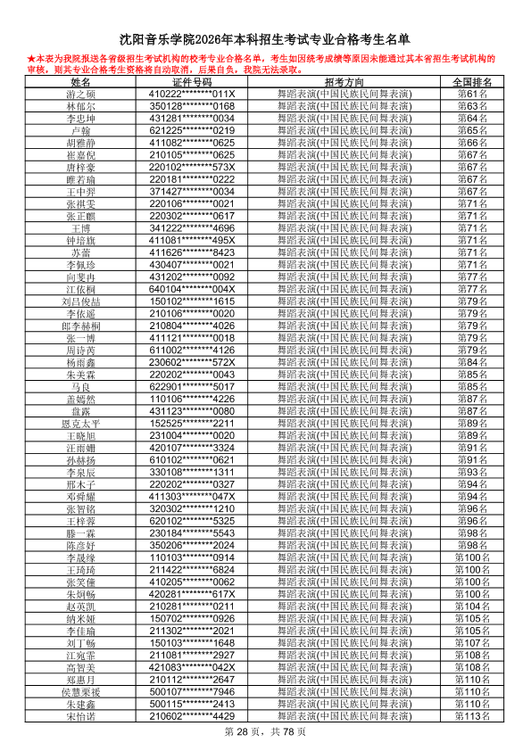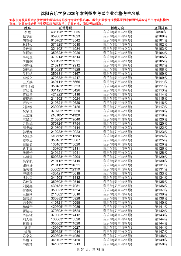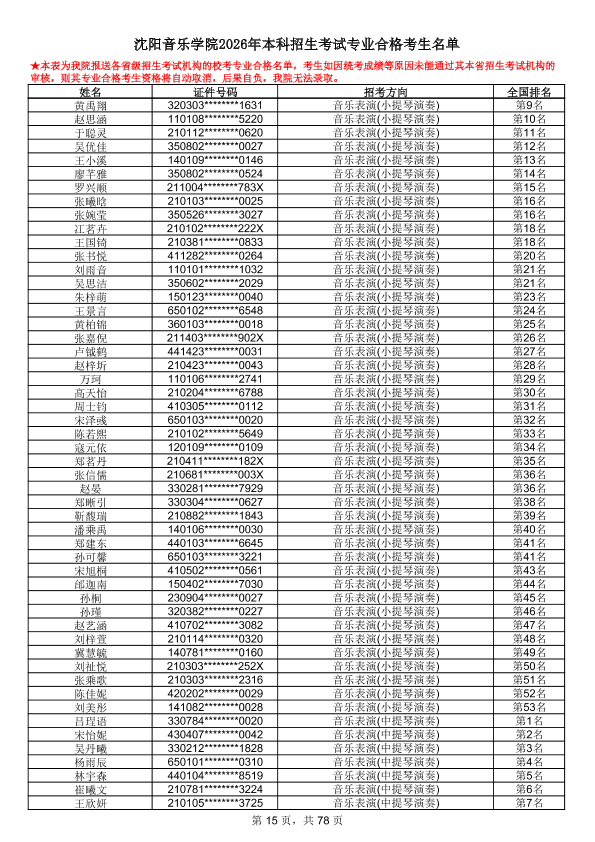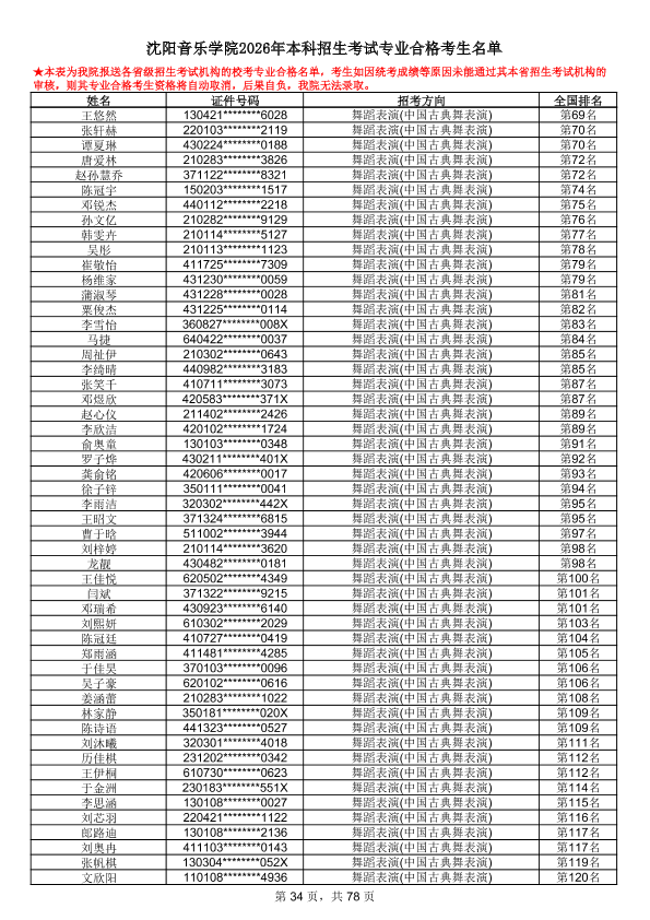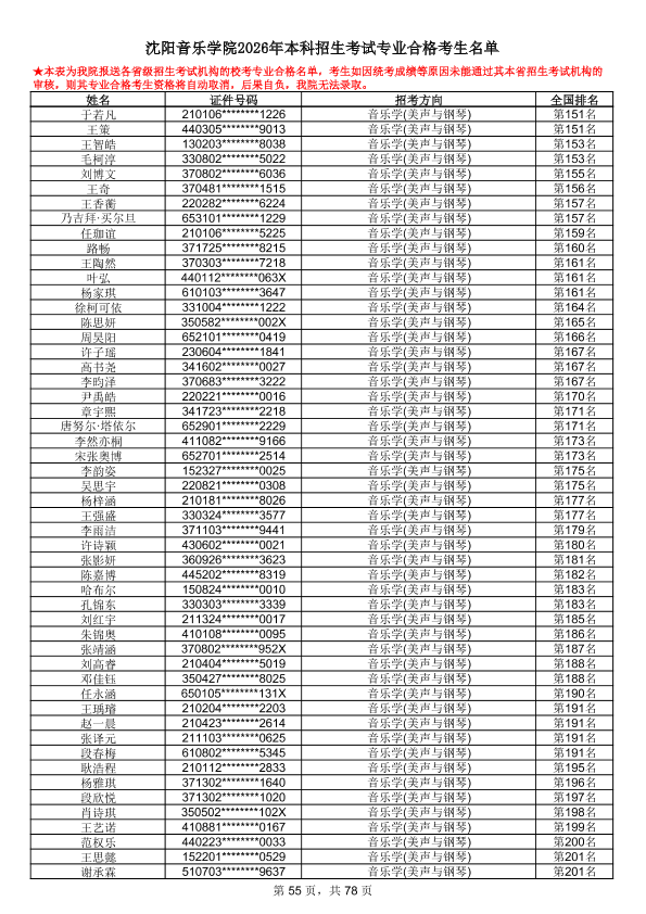沈阳音乐学院2026年本科招生考试专业合格考生名单