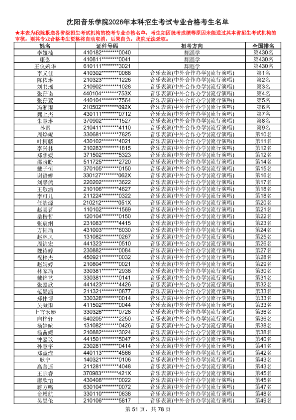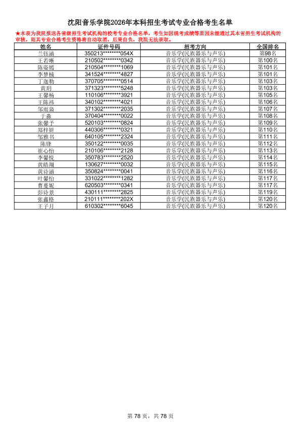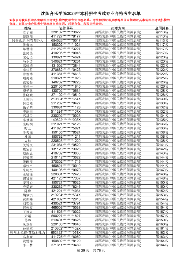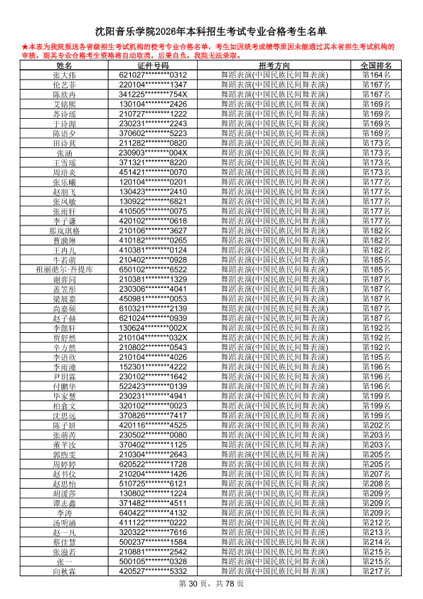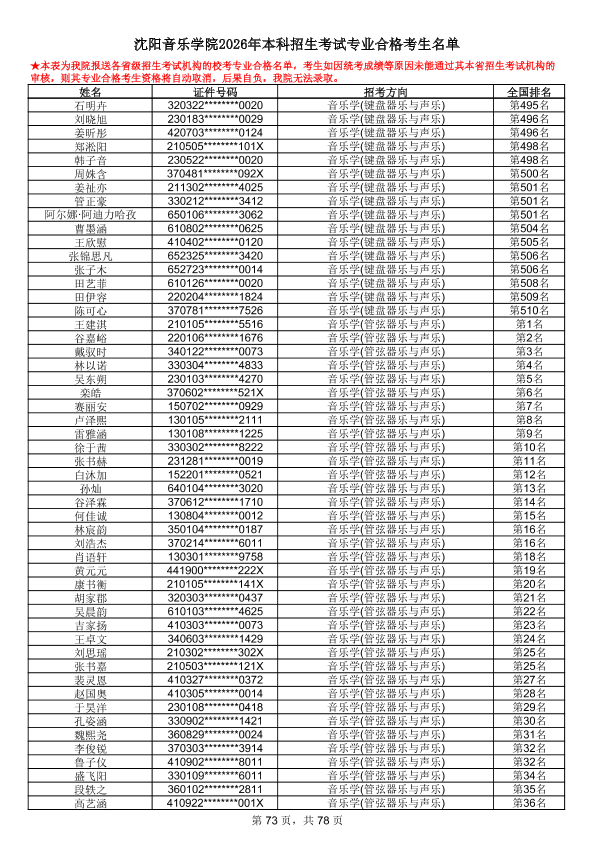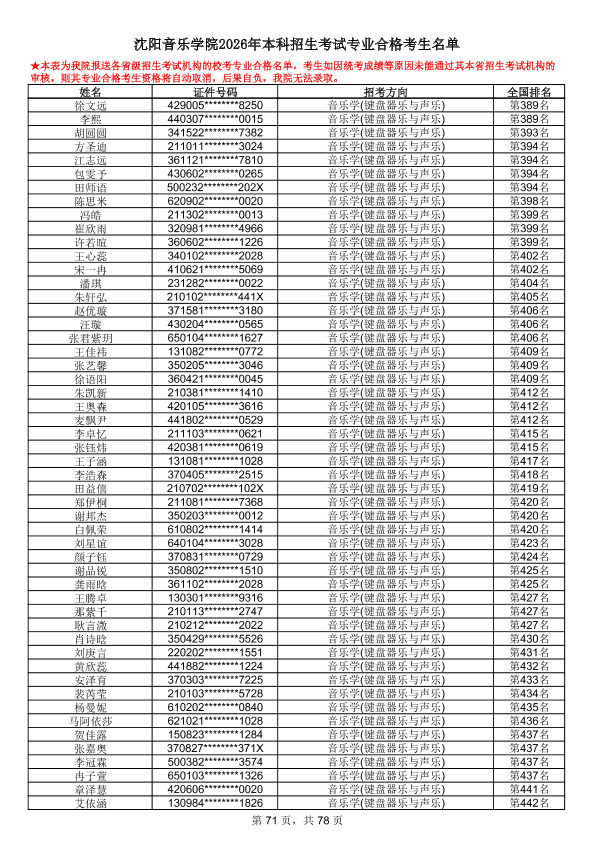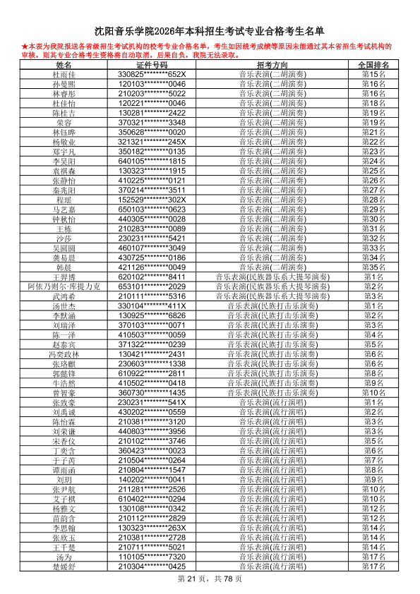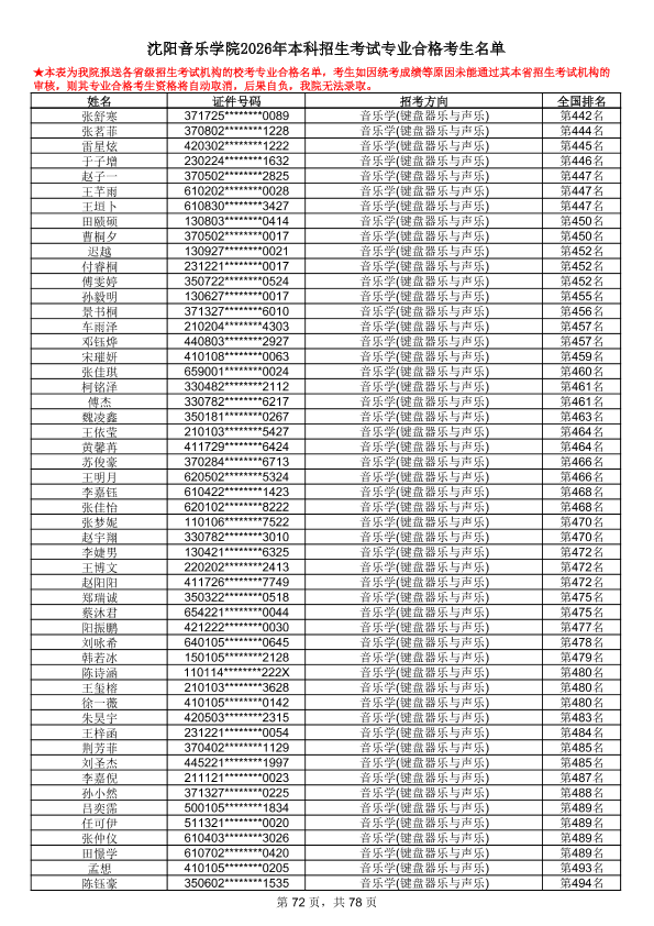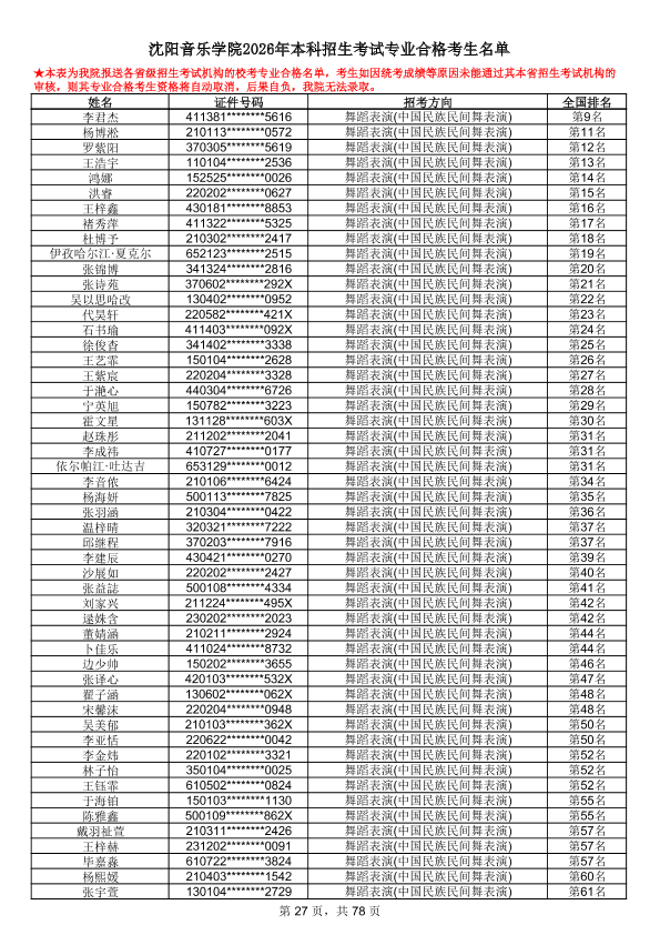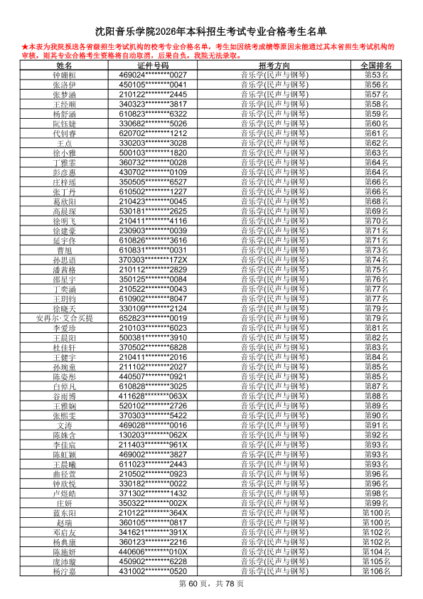 沈阳音乐学院2026年本科招生考试专业合格考生名单